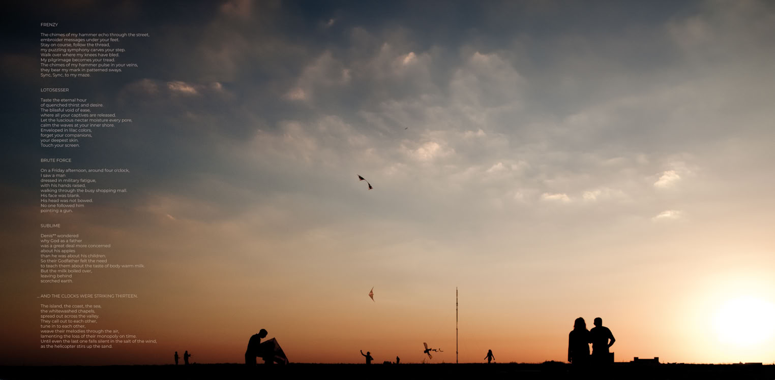 The peaceful scenery captured on the album cover evokes a deceptive glimpse of a world in limbo that might turn to ashes in seconds.Like a contemporary descendent of Angelus Novus,the storm that we call„progress“ pushes the Angel of History backward into the future while facing the past in front of him piling ruins upon ruins.